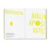 「そうしてあの有名なオランダのブックデザイナー、イルマ・ボームが来て、まったく新しいアジェンダ(スケジュール帳)を考え出してくれたのです。中のデザインが印象的で、印刷に用いられた薄い医療用紙が蛍光色を演出し、ミニマルなグラフィックと共に和綴じを彷彿とさせる製本で綴じられているのです。その紙の間に挟み込まれたカラーシートが、ボームがデザイナーとして最も大きくその力を発揮しためざましい部分でしょう。(キュレーターでありデザイン史家のマシュー・ロメン(Mathieu Lommen)がいうところの)ボームの大胆不敵なデザインは、このデジタルな時代において印刷物に再浮上させる力を与え、グラフィックデザイナーにとって、またより広い観衆にとっても、かけがえなくわくわくさせてくれるものに仕上げたのです。この魅力的な一冊は、我々の『時間の哲学』を本質的に変革するものでもあります。週単位のスケジュール表では、我々が日々自身に負わせる制約を書けるスペースが必然的に限っており、同時に、日本風に綴じられたページ群の内側には、勇気を出して端を押し広げてめくれば現れるまっさらで底知れぬ宇宙が隠れているのです。そこのダブル・プリントのページを見てみると、奇数のページには、常に変化し続ける月の満ち欠けが刻まれています。本来のゆったりとした、一年を苦もなく巡る毎月の月相、その時間の流れを体験することができるのです。そしてすべてが落ち着いたように見えた時、バン!ズバン、ドカーン!と、『未来派(展覧会でボームの作品に並列されていた、イタリア前衛芸術運動)』の本から引用された狂乱じみたイメージが現れ、時のダイナミックさを思い出させてくれるのです。」