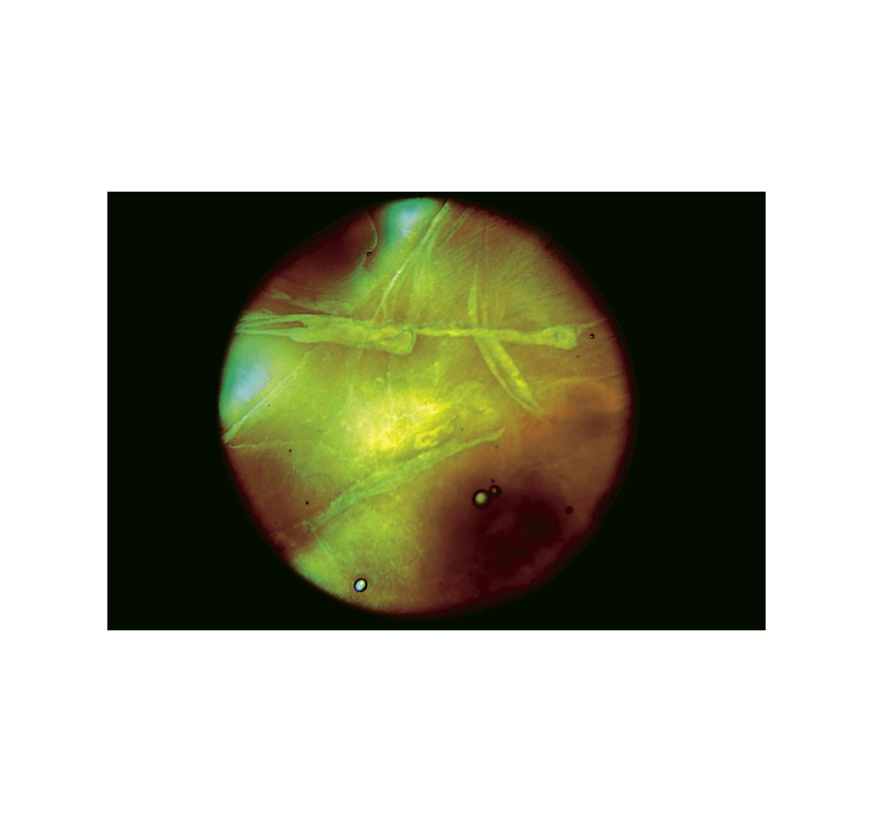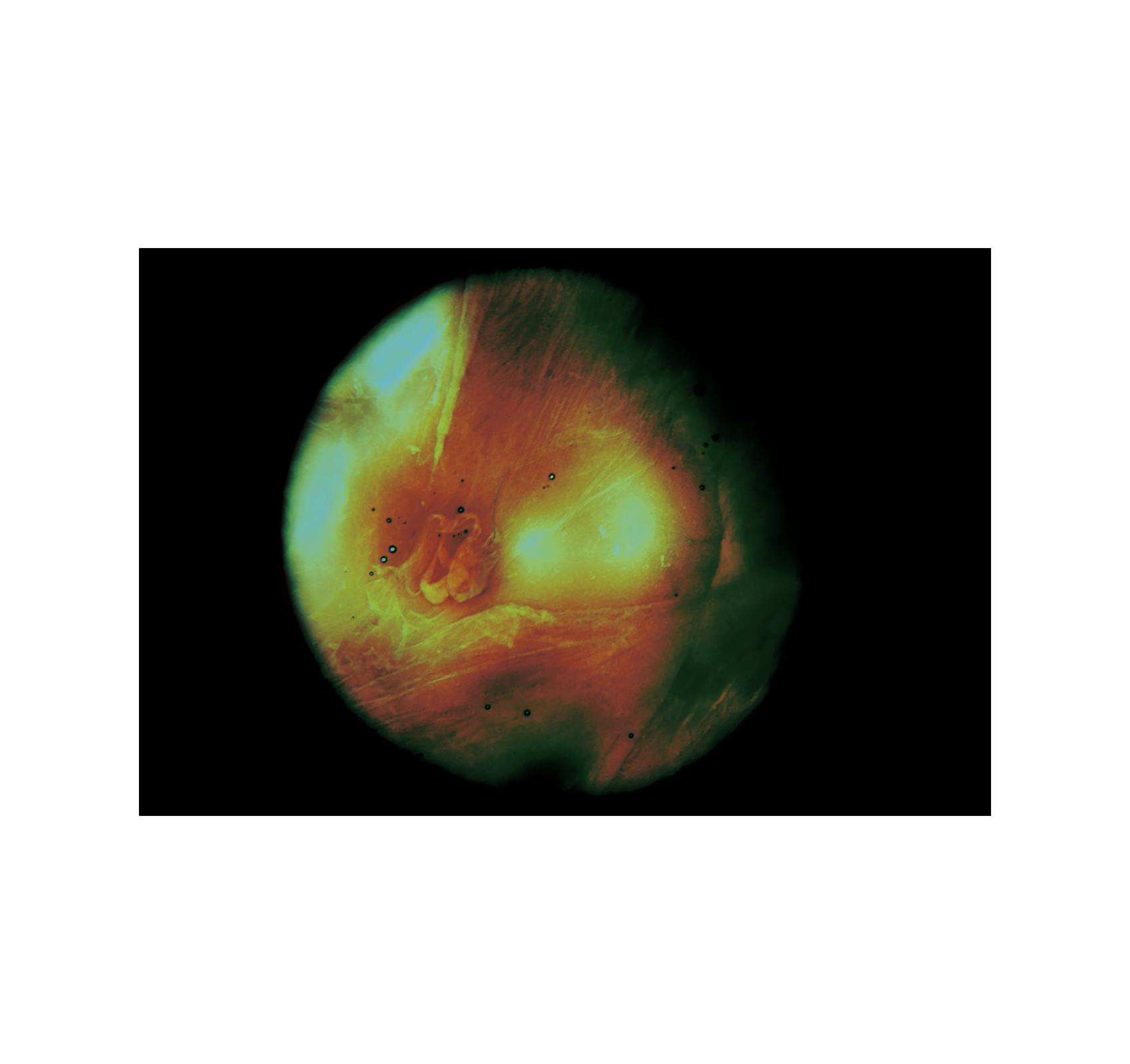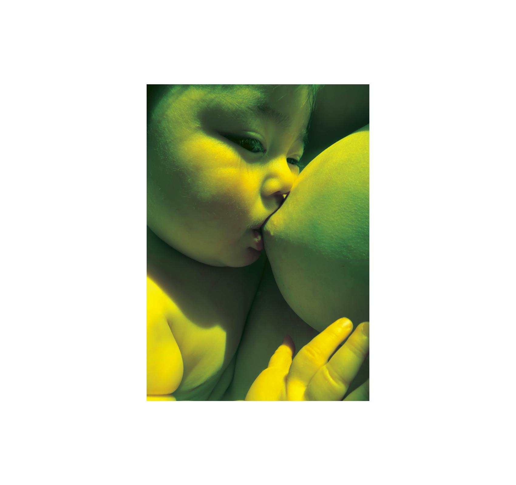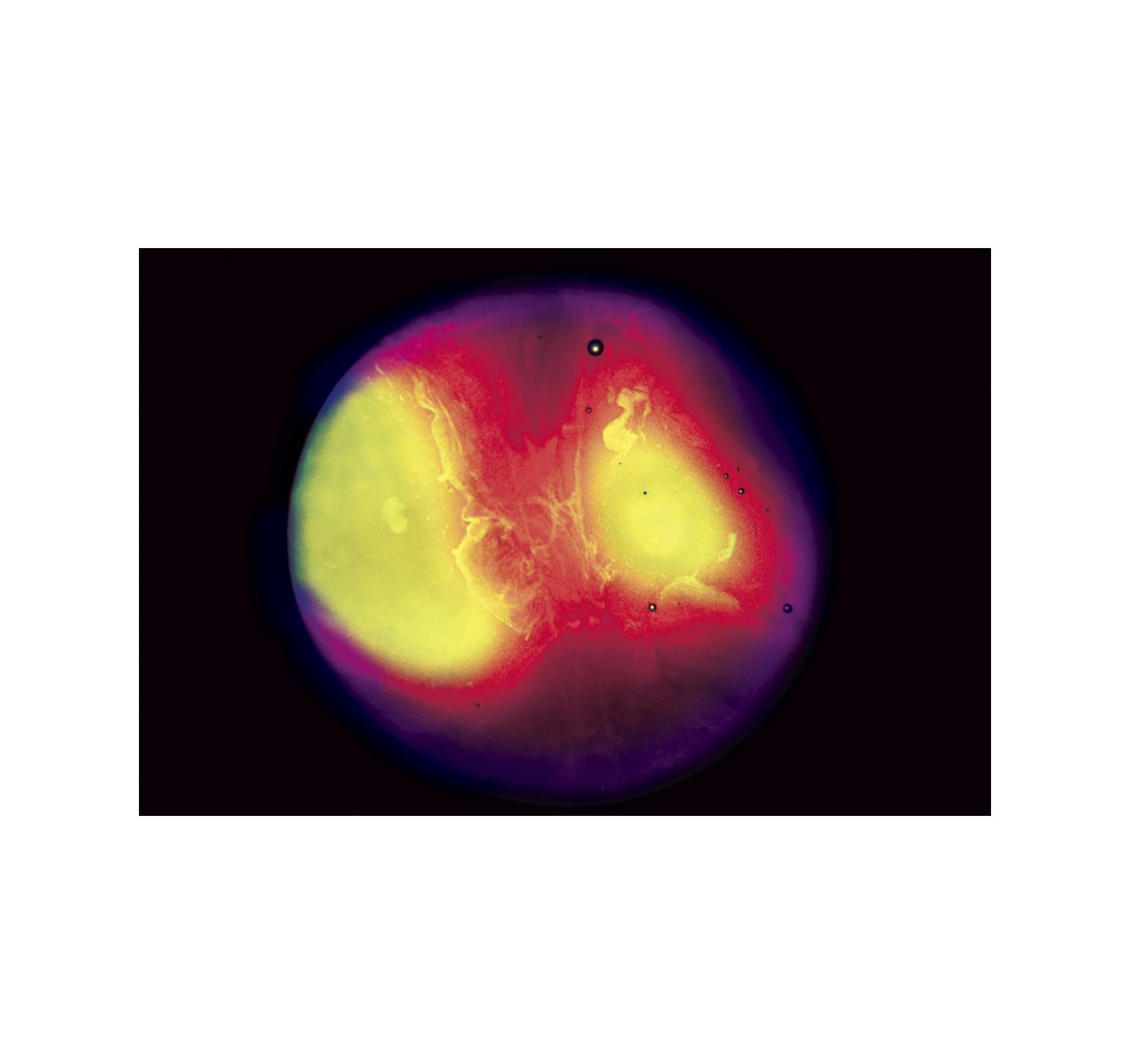 本書は二つの写真群により構成されている。前半は岡部自身が流産した際に集めた血液を夜な夜な顕微鏡で覗く行為を繰り返し撮影されたイメージが続く。この行為は前作『イルマタル』(2020)の生殖補助医療を用い、自らの身体を介して行った妊娠・出産を「実験」のように捉えたものと通底する態度がある。顕微鏡を覗いた先に現れるイメージは、なにかの形を成そうとしているようにも、その形が崩れているようでもある。また、それらは豊かな色彩とともにあり、惑星の地表や星雲などを写した天体写真のようにも見えてくる。ここではないどこか遠くの場所を目で辿る岡部の行為を反復するようにページを捲る。