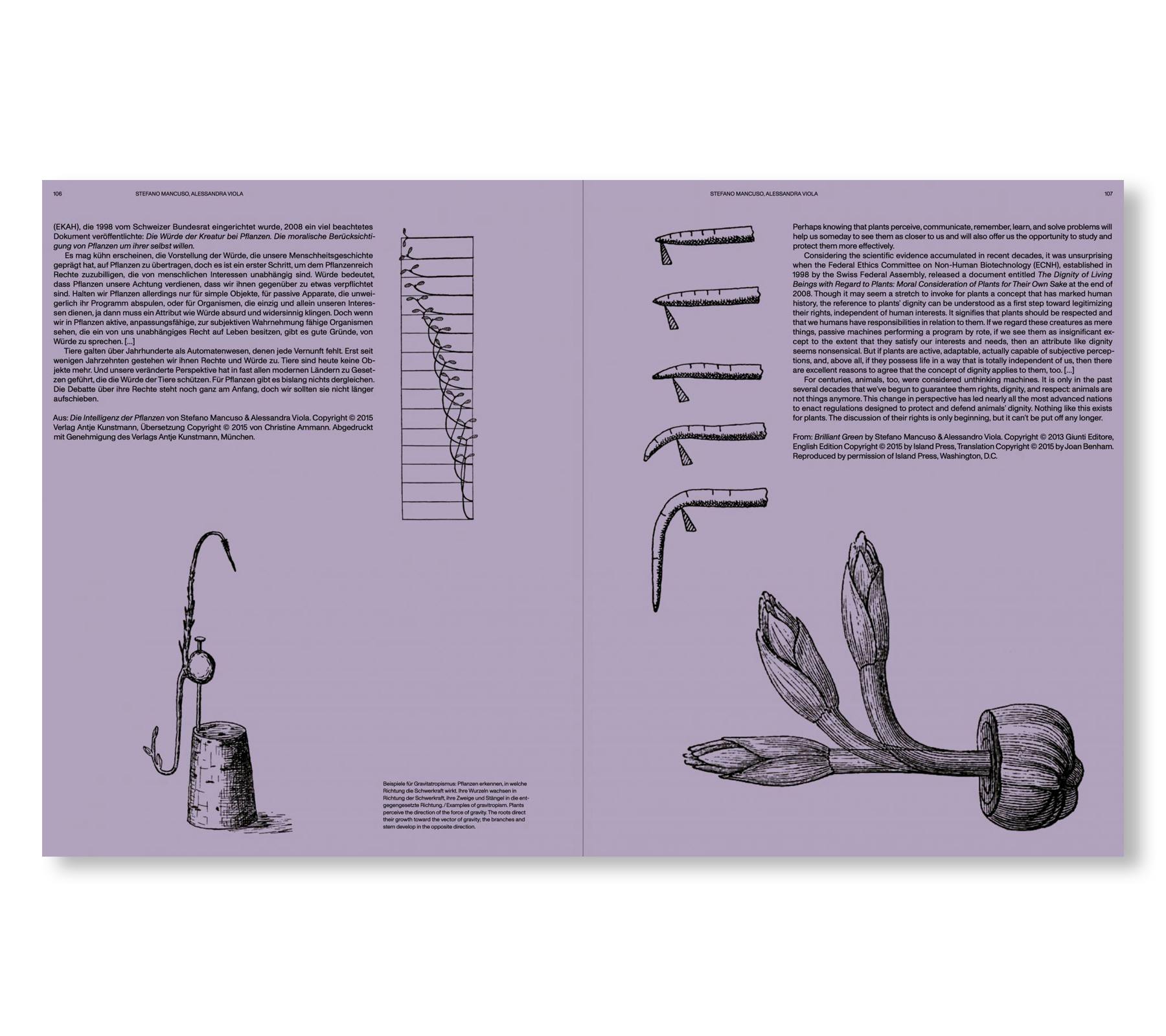 「ヴィラ・メルケル(Villa Merkel, Galerie der Stadt Esslingen)」で開催された展覧会「The Senses of Plants」の記録であり拡張版でもある本書は、学際的な執筆陣によるテキストも収録する。パコ・カルボ(Paco Calvo)&ナタリー・ローレンス(Natalie Lawrence)、アンドレアス・グートマン(Andreas Gutmann)、ピエール・L・イビシュ(Pierre L. Ibisch)、ステファノ・マンキューゾ(Stefano Mancuso)、アレッサンドラ・ヴィオラ(Alessandra Viola)&ロビン・ウォール・キマラー(Robin Wall Kimmerer)、ユリア・カタリーナ・ティーマン(Julia Katharina Thiemann)らが寄稿している。