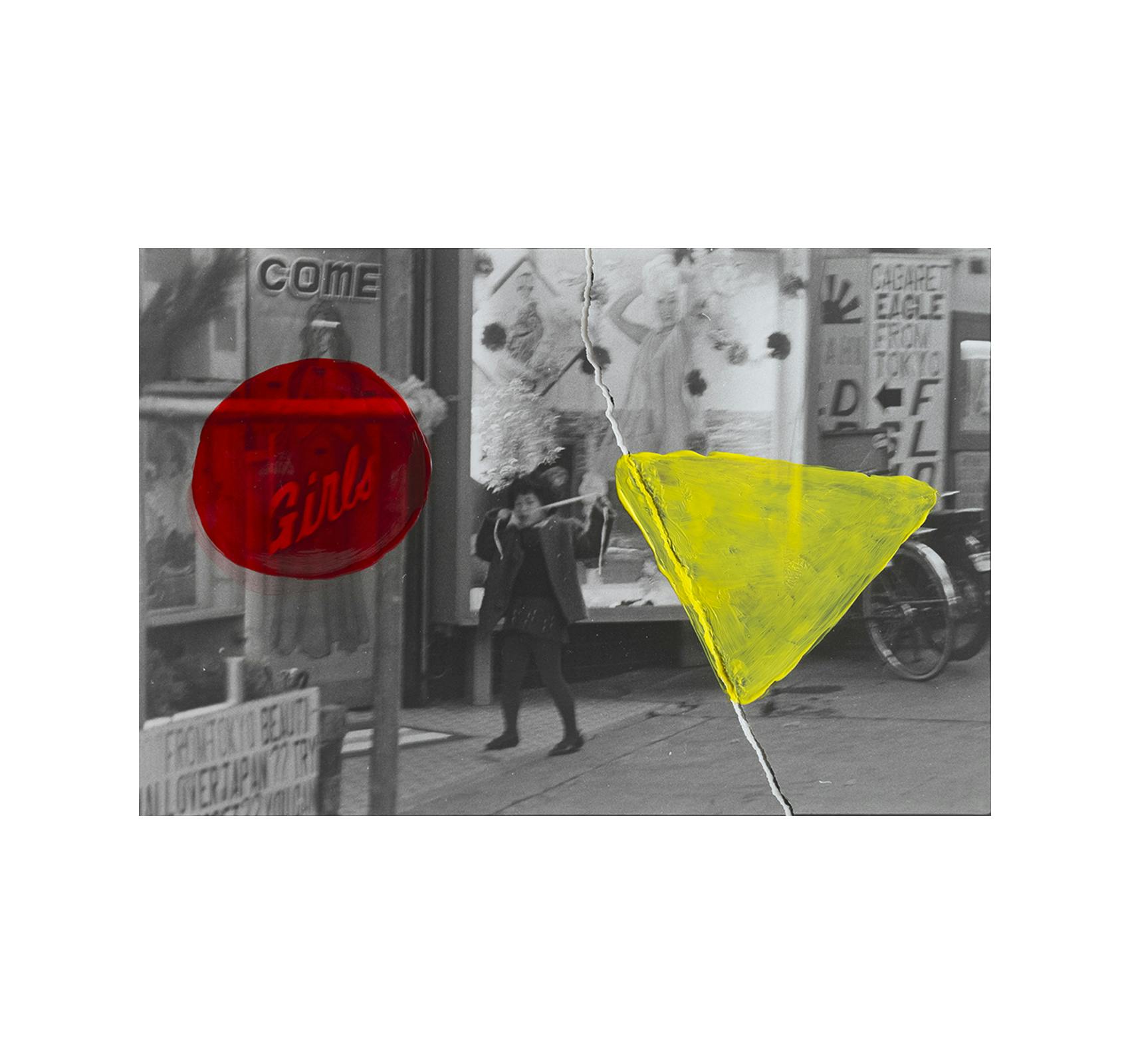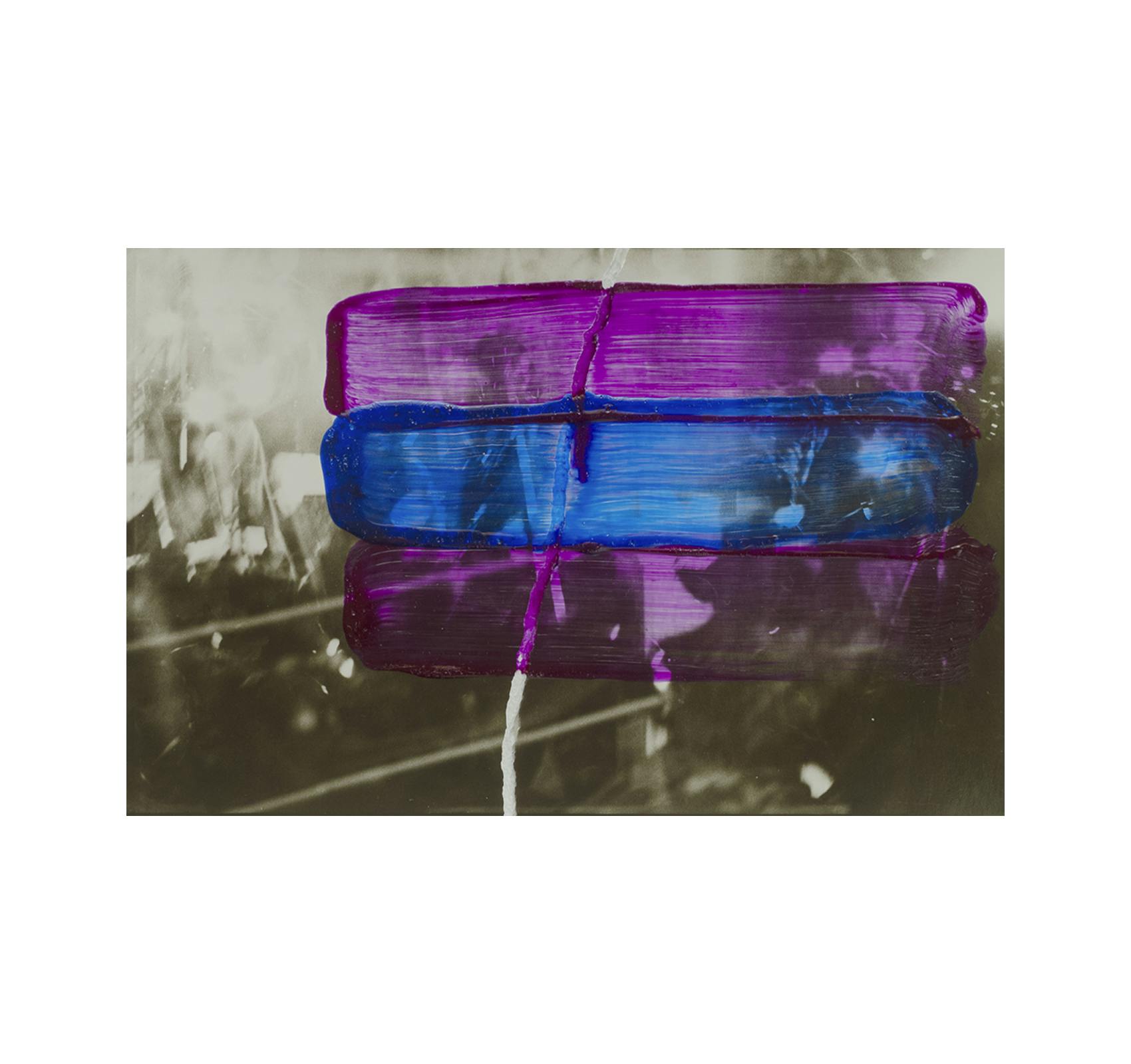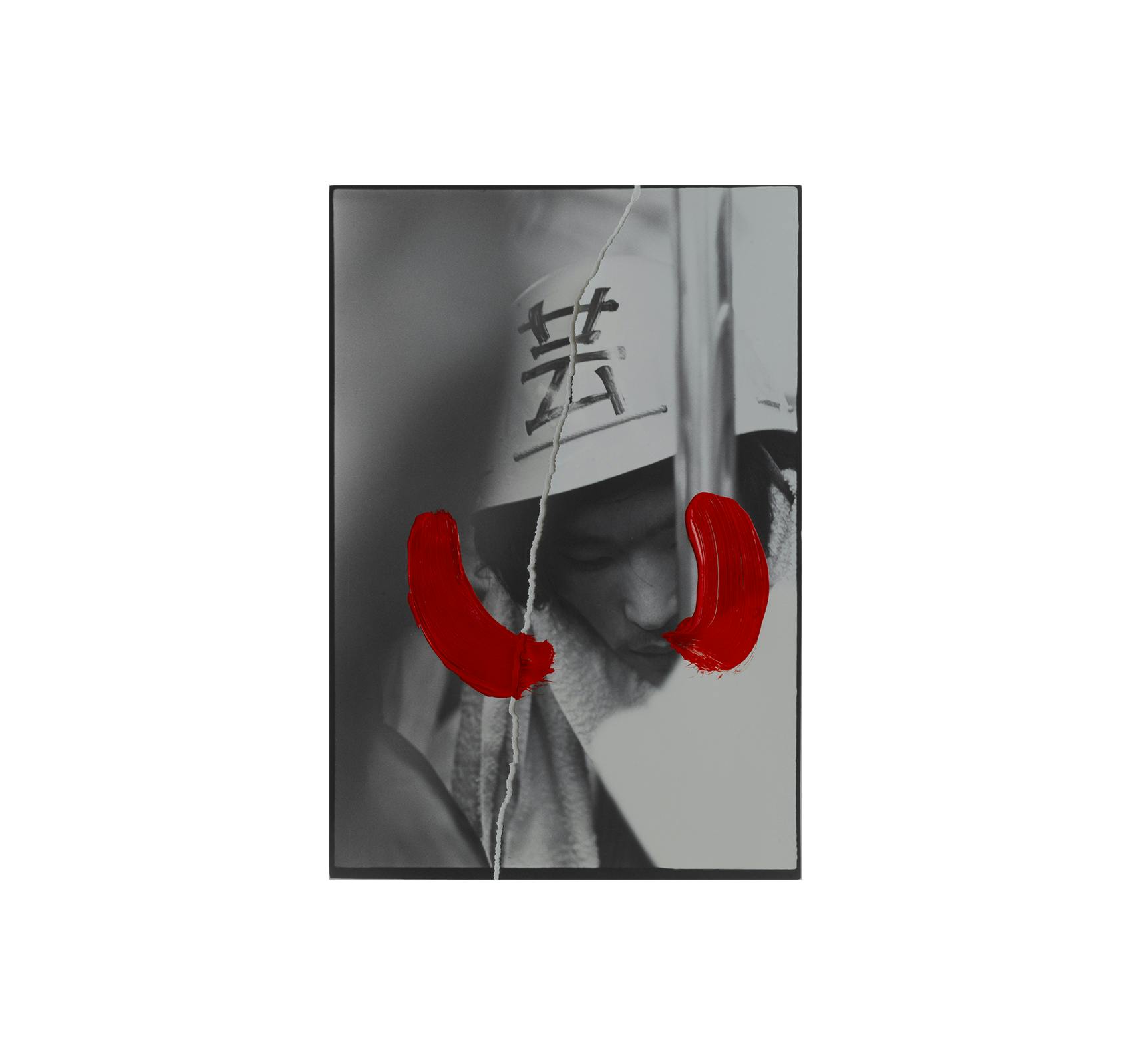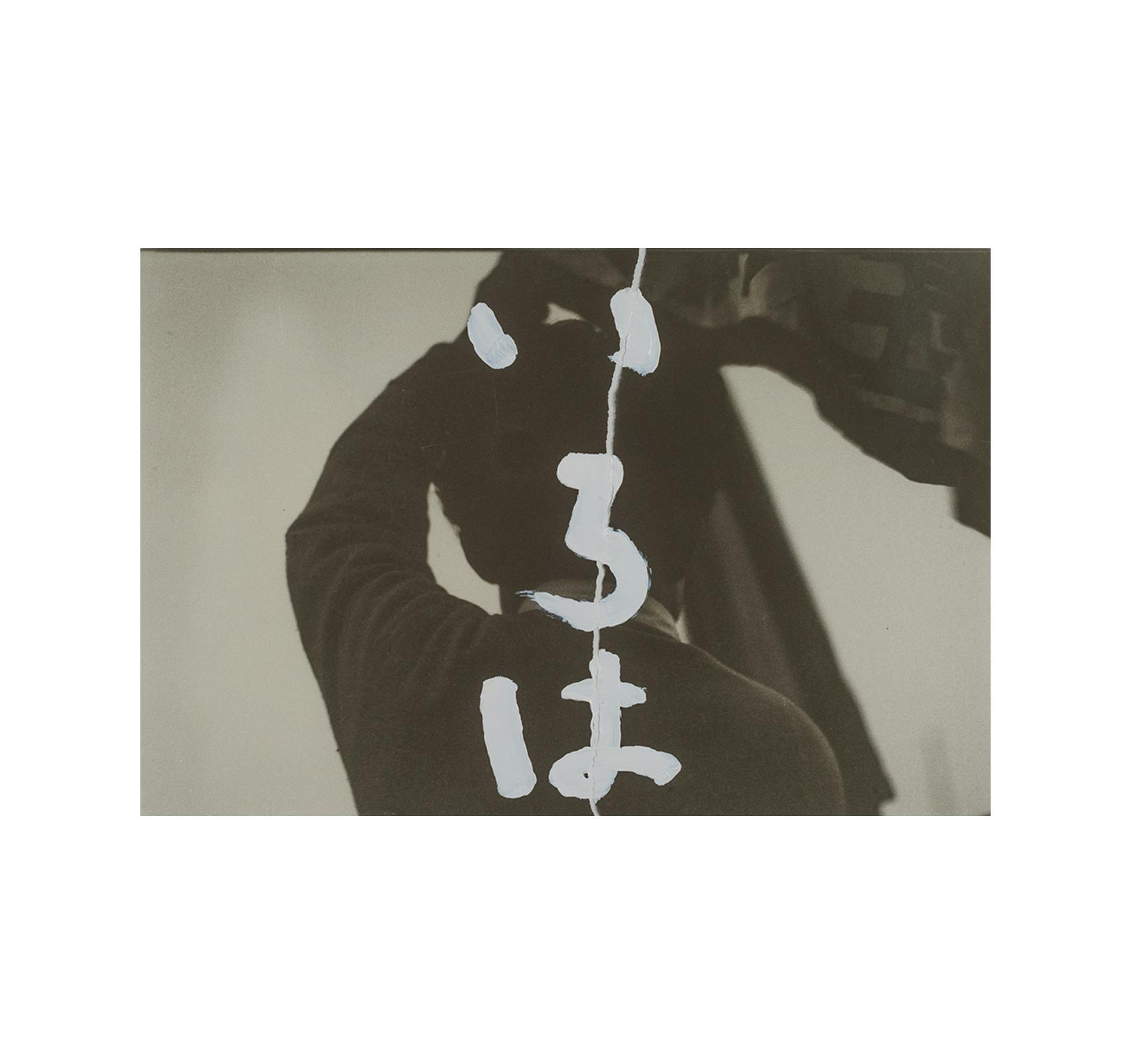 ゼラチン・シルバー・プリントを裂き、絵具で覆うことで、写真は物質へと置き換えられる。記録は抽象へと転じ、イメージは文字とペインティングのあいだに位置するハイブリッドな形式のための支持体となる。本作は作者の実践における決定的な転換である。その主題はもはや証言ではなく、再解釈にある。