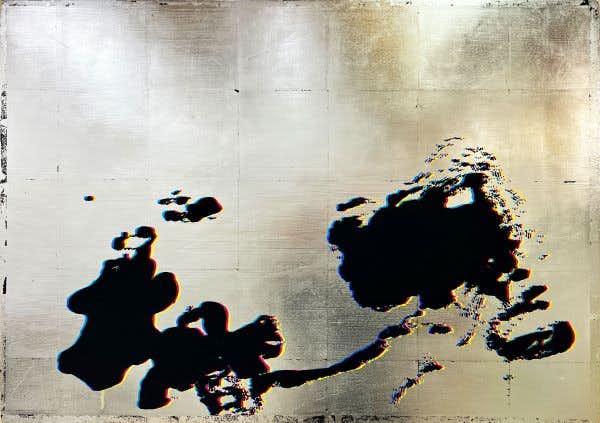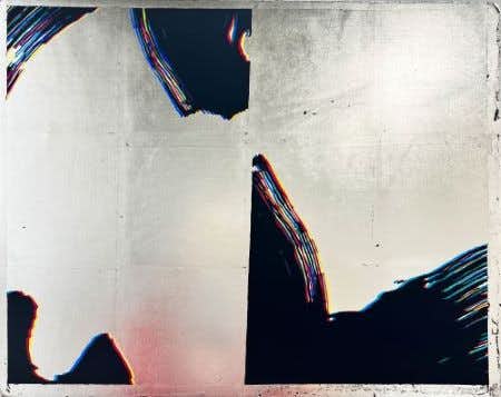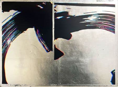 この特徴的な制作方法が生まれたきっかけは、大学2年生のときに遡ります。大澤は当時受けた授業を契機に、イラストレーター上で加工して押し潰した横長の文字の羅列を描いた抽象画を発表していました。文字を並べると意味を持った言語となるはずが、変形すると解読不能のただの線のようになってしまうことから着想し、具象から抽象への変化を表現した作品。下書きに時間のかかる作品であったため、効率良く複製できる方法を思考錯誤していました。その折にコピー機を使い、何かのはずみでズレが生じた印刷物が生まれた現象にヒントを得て、現在の制作へと発展していきます。コピー機でスキャンするときに起こる光が動く現象を画面上で再現するために、メディウムには銀箔を使用、直接目に反射される光を表現。キャンバスのサイズはA4の比率で展開し、コピー機のサイズ感を想起させます。
