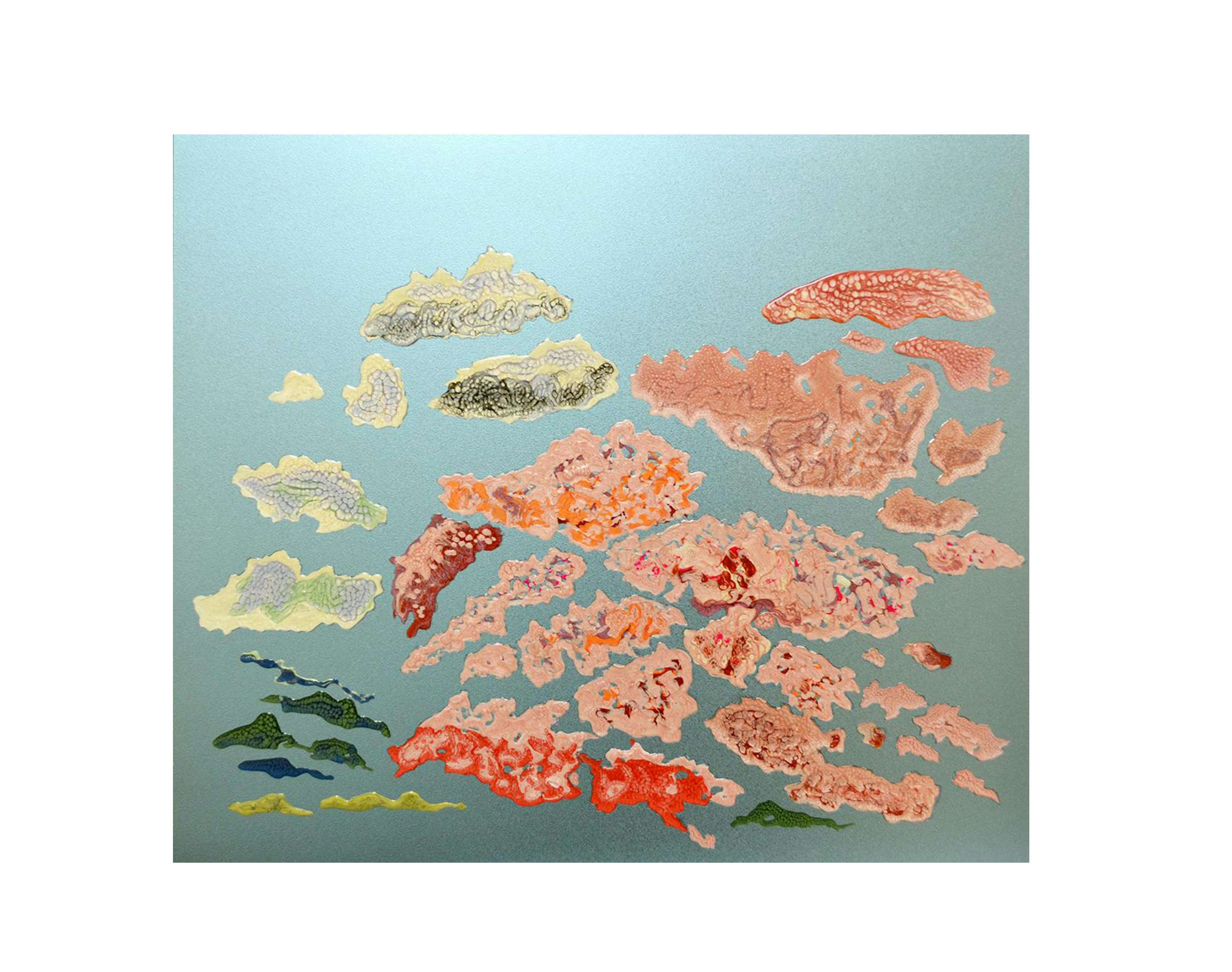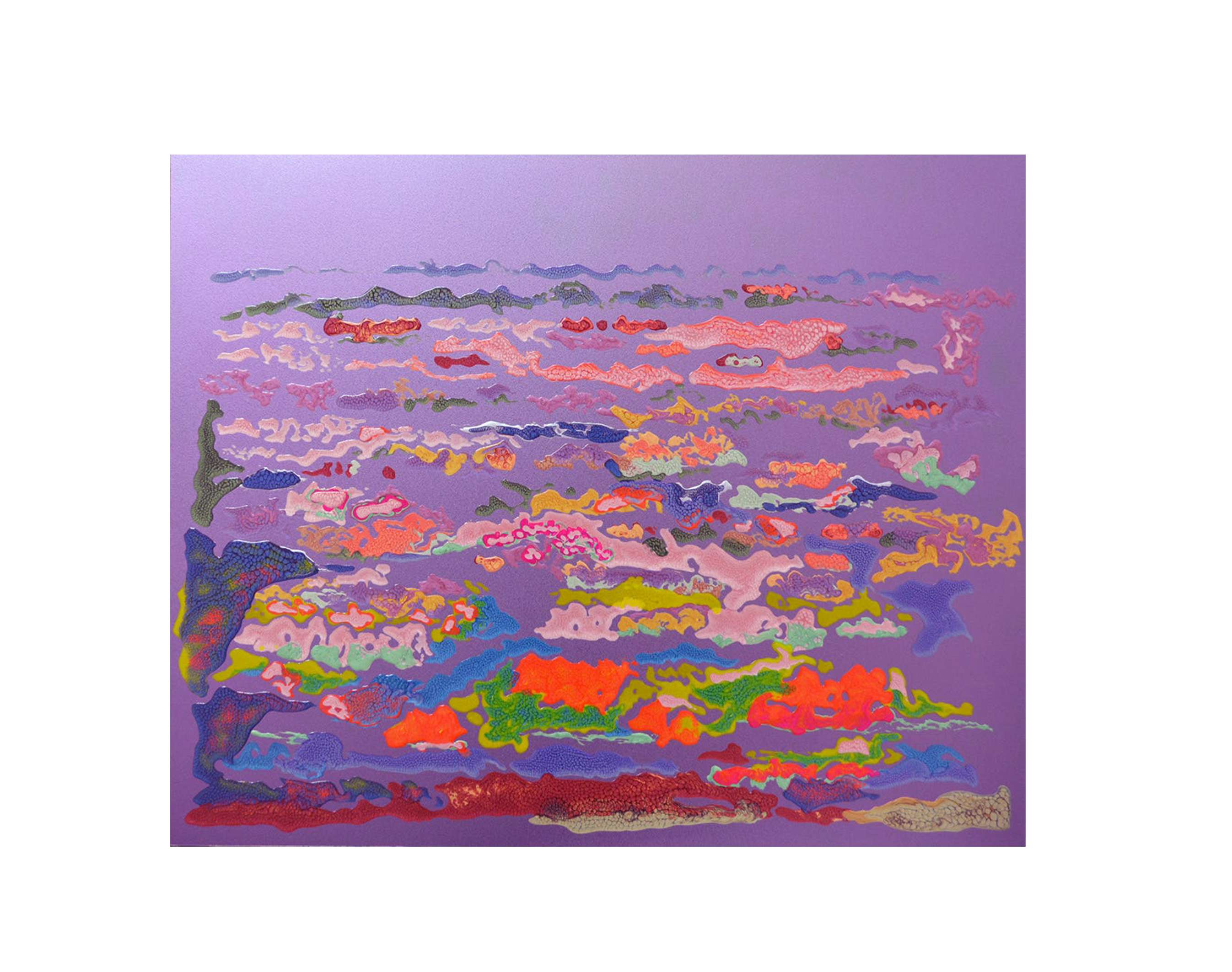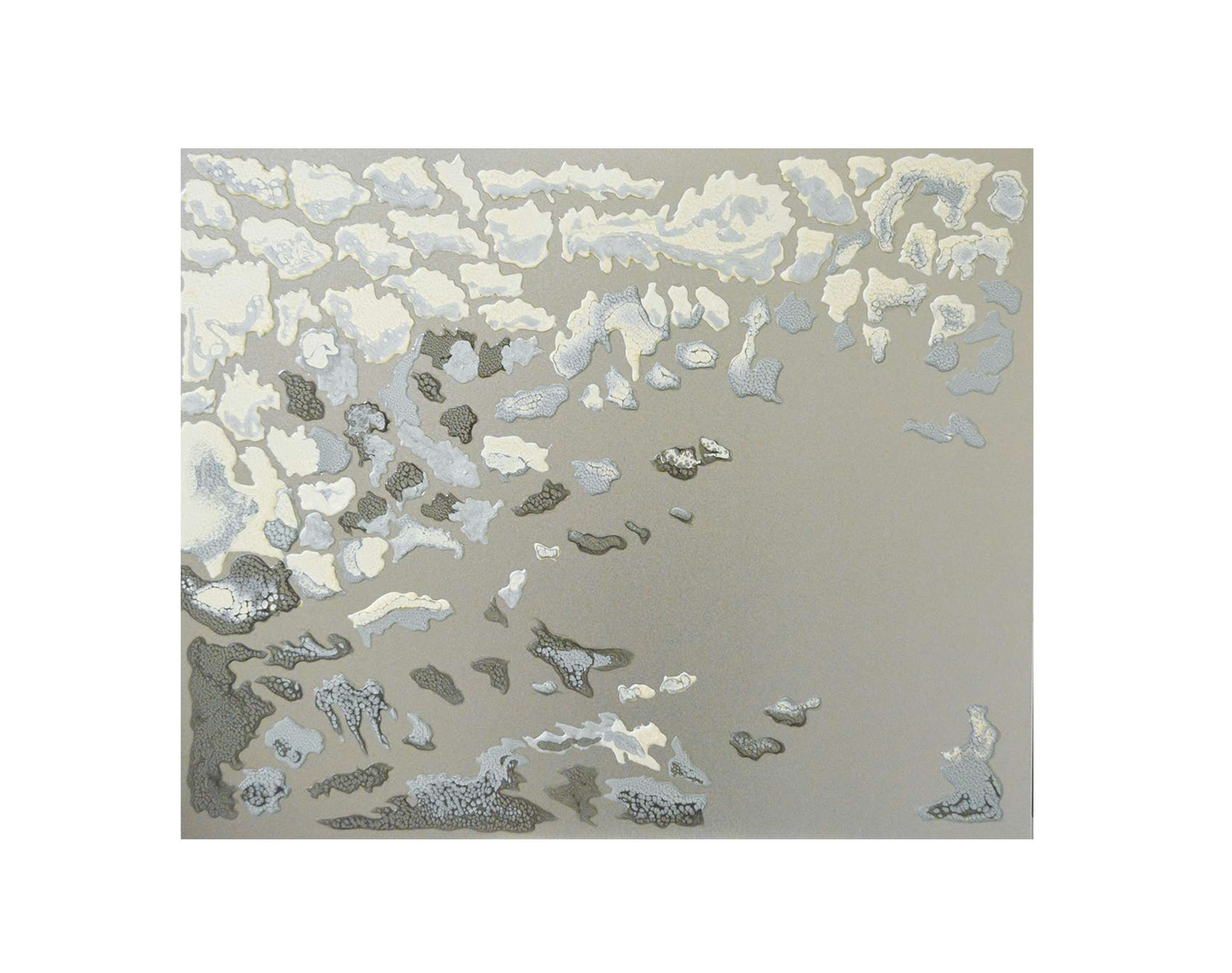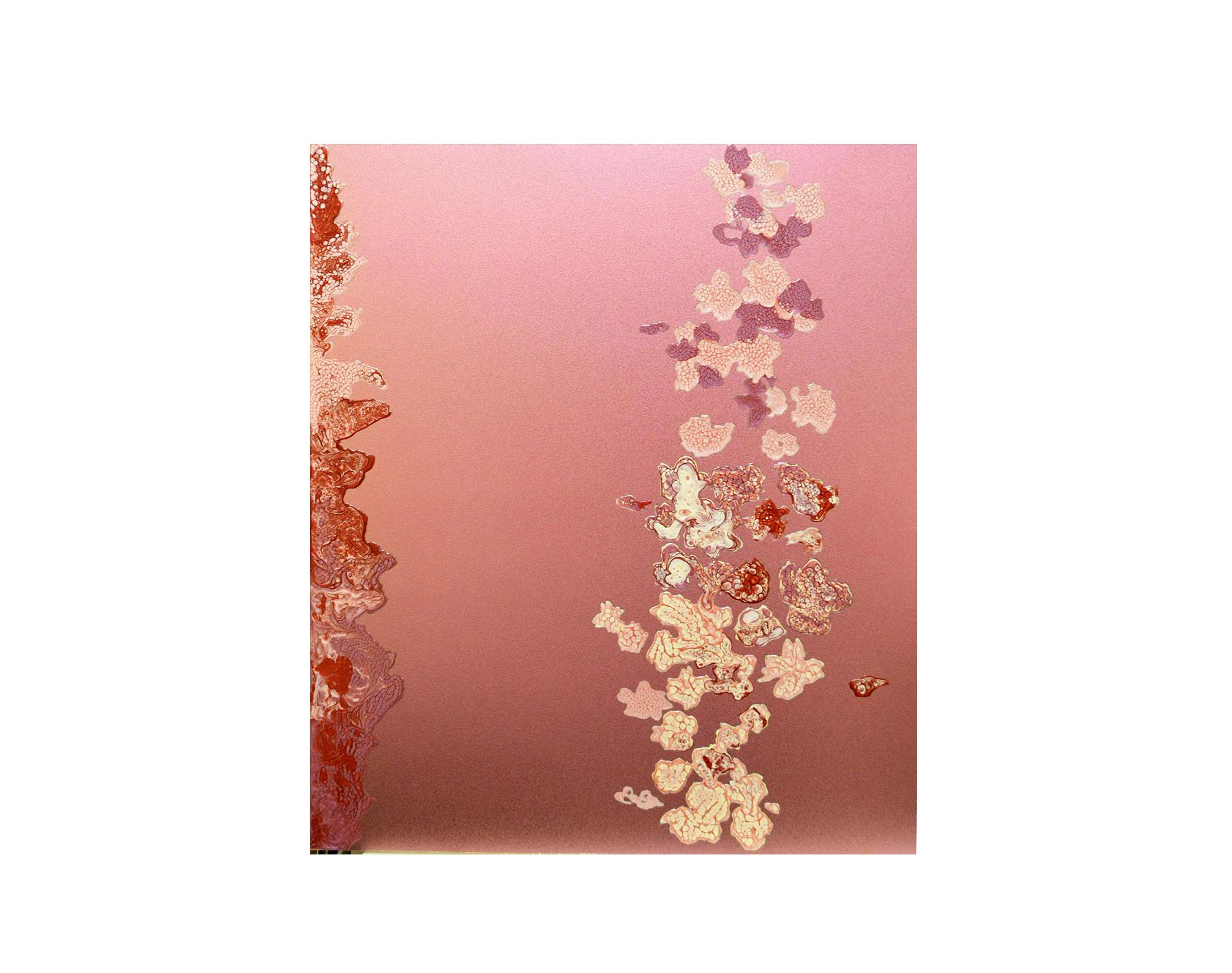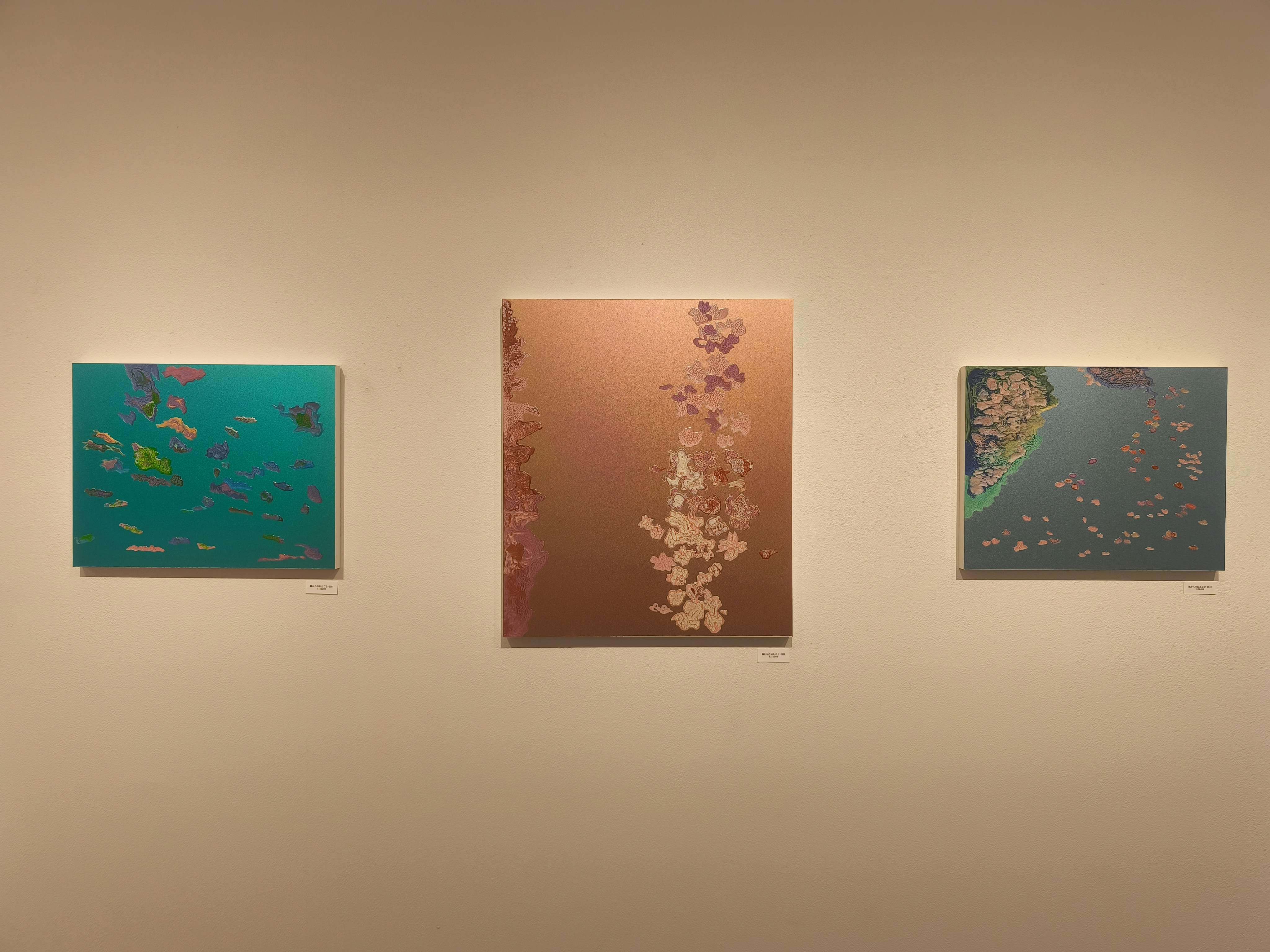 本展では、新作20点を展示予定。井坂がテーマとして掲げる「虚像と実像の混在」を通じ、鑑賞者に新たな視点を提供する展示となっています。井坂の作品は、チタンの板を支持体に樹脂で描く独自の技法を用い、工芸のようにも見える視覚的な表現力が特徴です。酸化被膜を施した金属の表面は、まるで水面や空のような質感を持ち、抽象的な被写体は儚く消えていく波や雲のようにも感じられます。