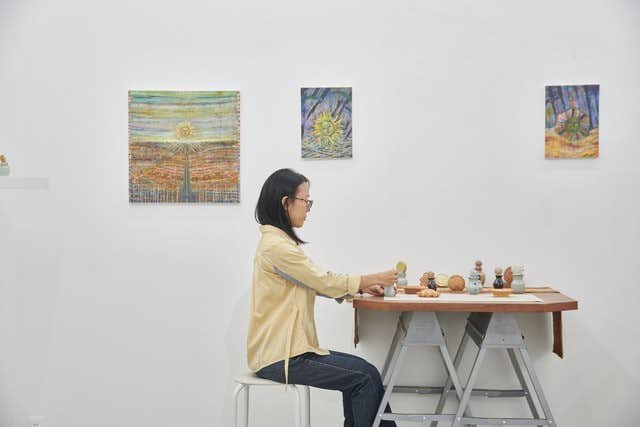 以前は旅先での風景を鑑賞者それぞれの物語を想起させるよう作品に落とし込まれるものでありましたが、近年、旅は「精神世界の旅」を意味するようになってきています。彼女にとって制作は、「『儀式』であり『快楽』を感じる側面がある」と言います。近年始めた陶作にも、ぐるぐると回転し続けるろくろに向き合う行為が「瞑想」のような感覚を覚えていると言う。現在はそんな「魂の動き」を旅として、制作に反映させています。
