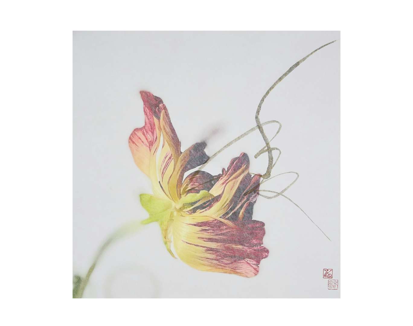 本展では、久保と春陽が作品を共同制作。柔らかさとしなやかさを大切にしながらも内に強さを秘めた「たおやか」という生き方をテーマにとらえています。花の写真と書の美が重なり合い、伝統素材である竹和紙と美濃薄紙を用いた繊細な作品群は、見る角度や光の移ろいにより異なる表情を見せます。今回発表する21点の新作はすべてスクエアフォーマットに統一。公正、安定、調和の象徴を意図したスクエアのかたちは、現代の暮らしに寄り添う上質なアートピースとして存在感を放つことでしょう。現代に生きる私たちの「心の在り方」にそっと寄り添う、美と静謐に満ちた空間をオンラインでもご堪能ください。