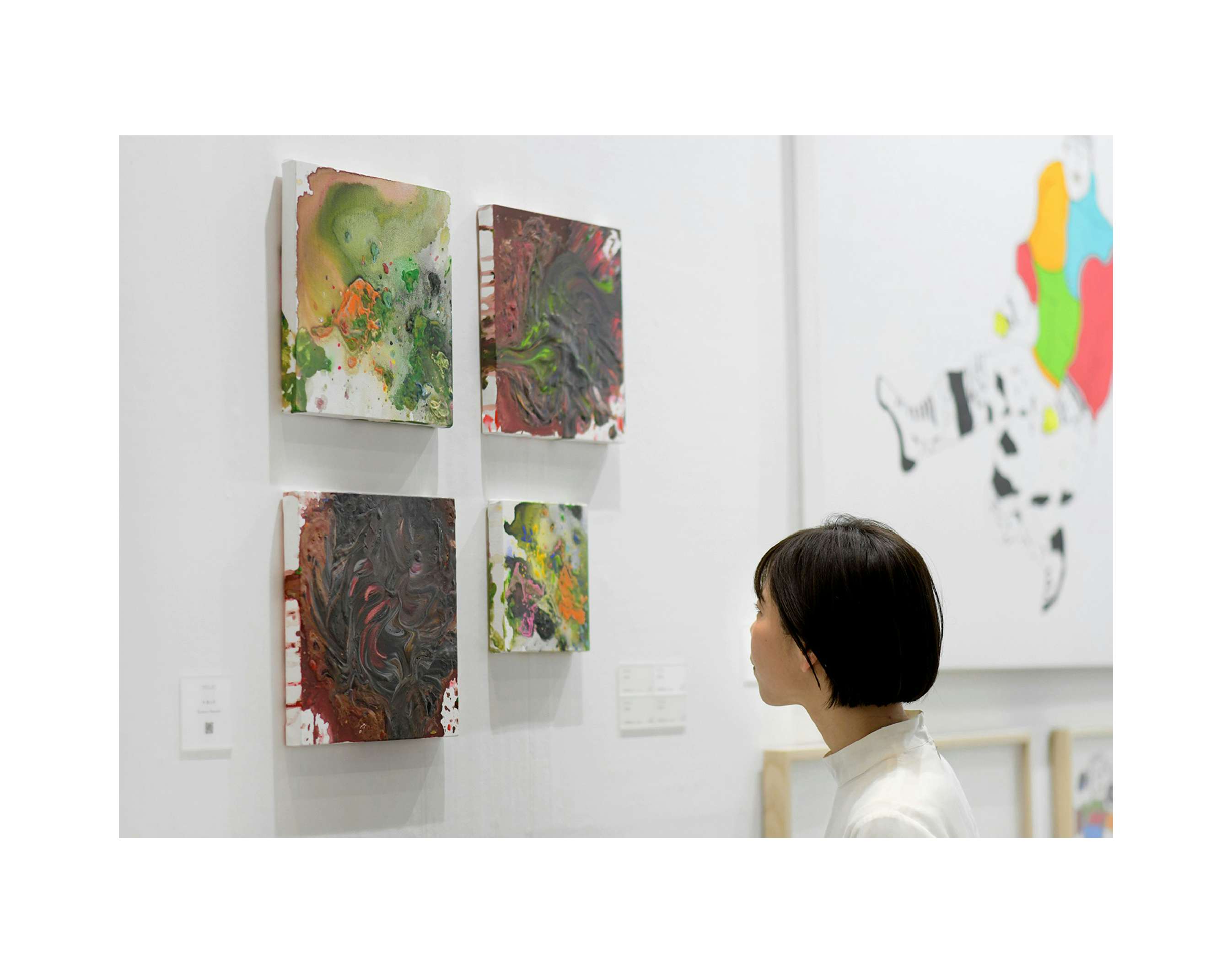 2002年生まれ。キャンバスや紙に絵具を落とし、手のひらで作品を制作するスタイルは、まるで絵具と戯れながら感触を楽しみ、「制作」という行為自体に重きを置いているようである。飛び散った絵具の偶発的な痕跡と手のひらが生む色彩が共存し、観る者に解釈の余地を残す。百貨店やアートフェアへの出品を重ねている。