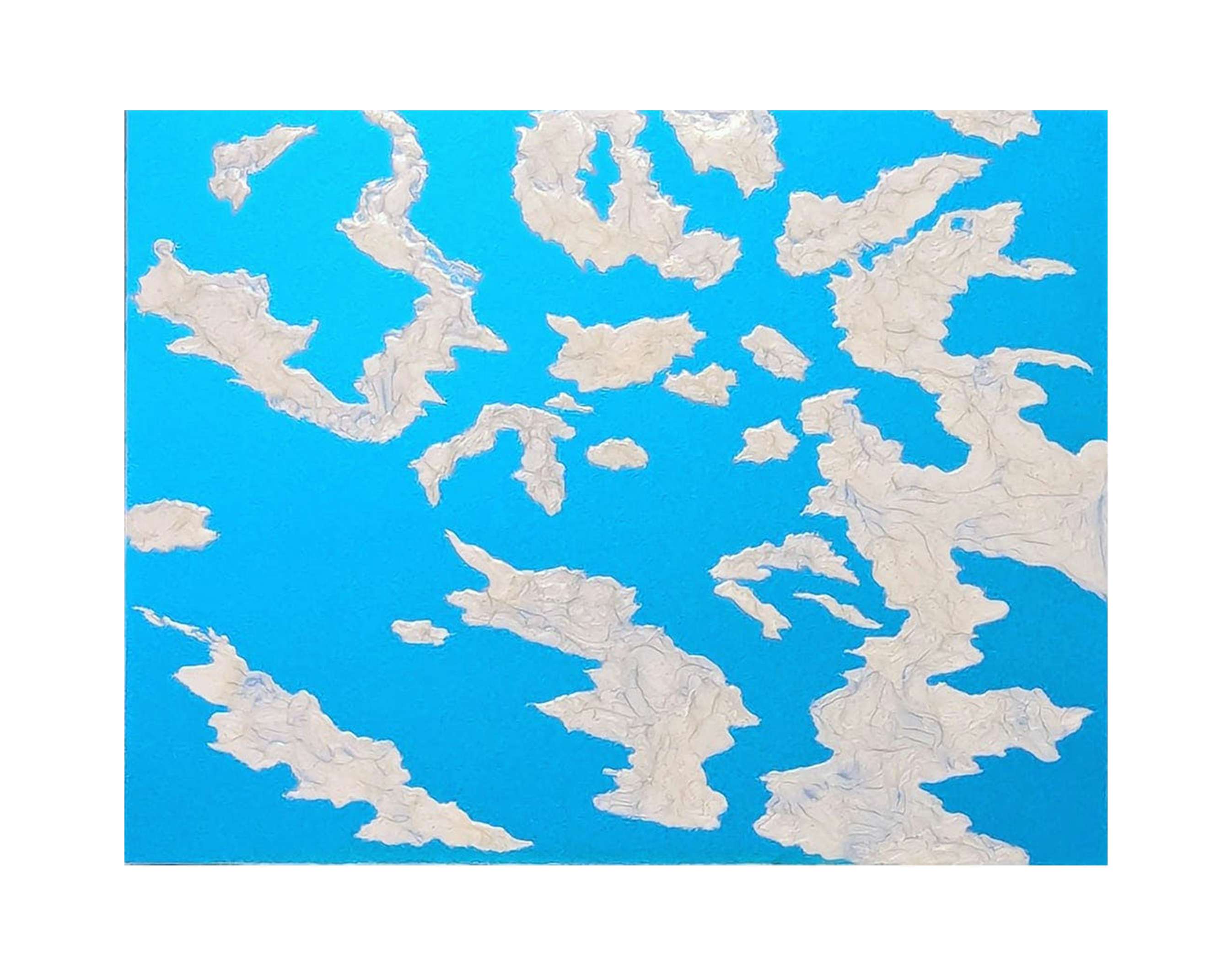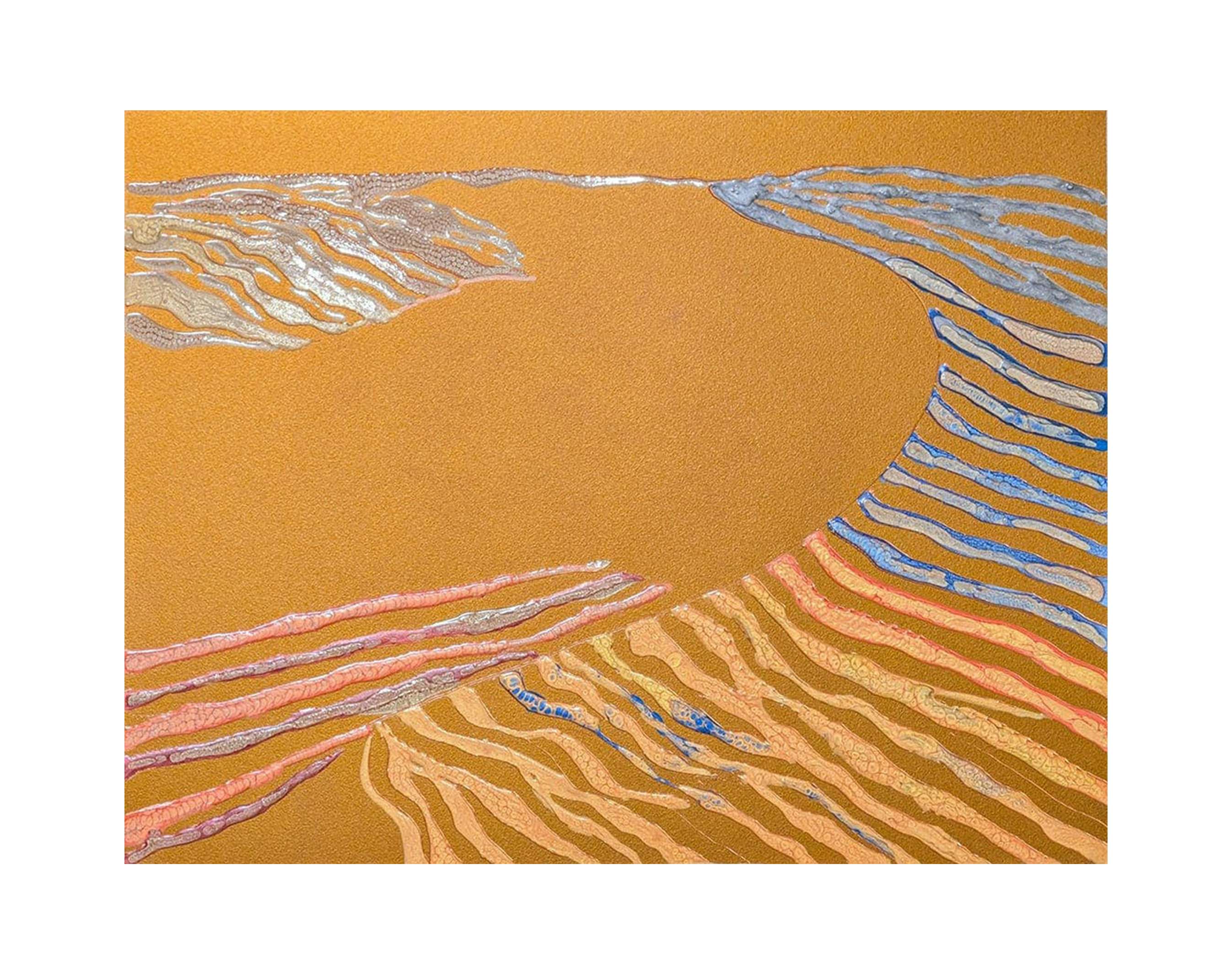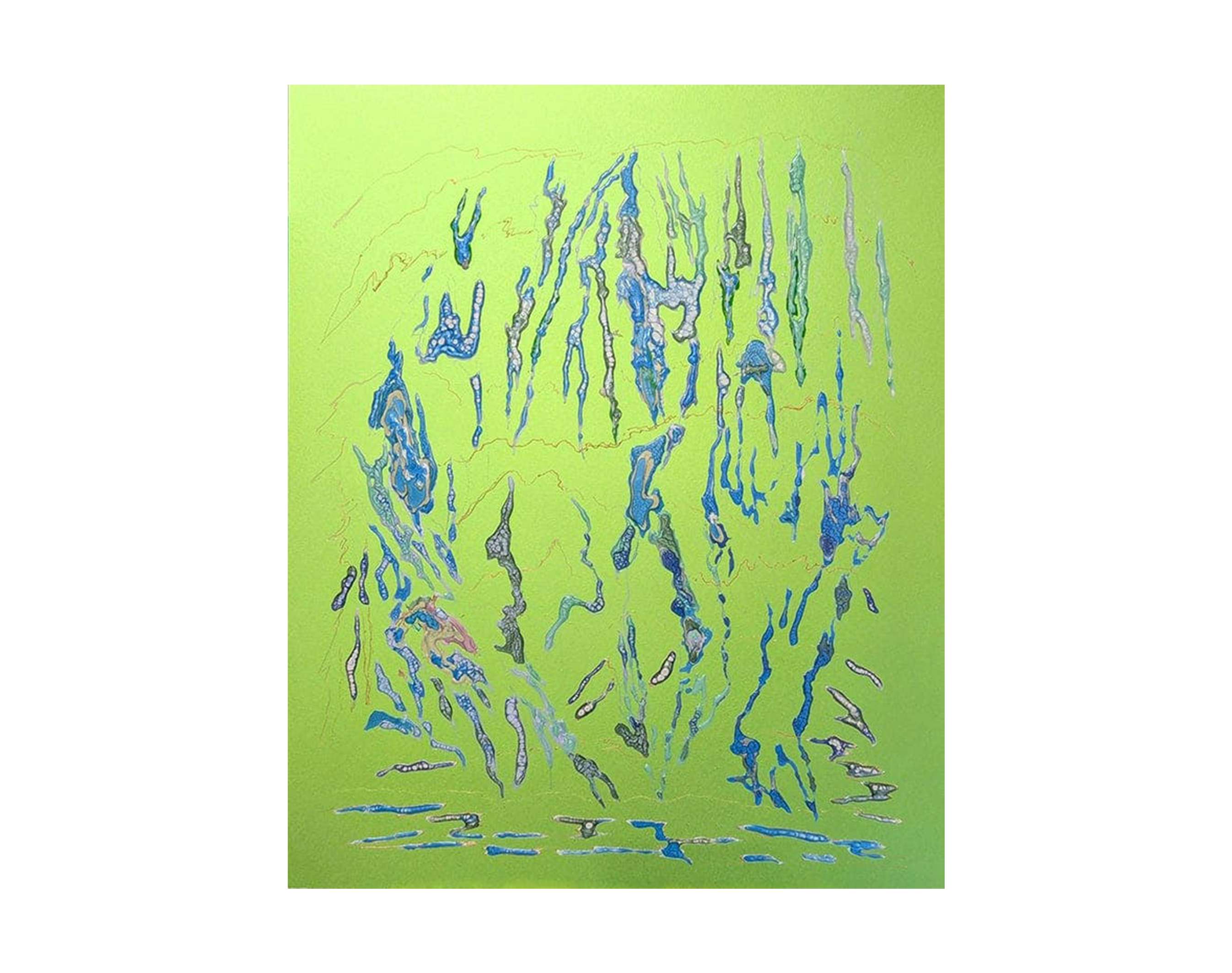 本展では、陽極酸化皮膜を施したチタンにアルキド樹脂絵具を重ね合わせた絵画作品を発表。光の屈折から色彩が変化する作品の表面は、鑑賞者の位置や視線の角度、距離、高低差によって異なる表情を見せます。アルキド樹脂絵具で描かれた箇所には、気泡のように分裂する表情が現れ、網の目をくぐり抜けるように下層の色彩が浮かび上がる構造を成しています。それは雲や花を彷彿とさせ、一定の姿を留めない存在のようにも感じられます。会場は絵画作品約13点で構成、加えて10×10センチメートルの小作品も発表予定です。会期にあわせ、「OIL」でも出展作を販売いたします。