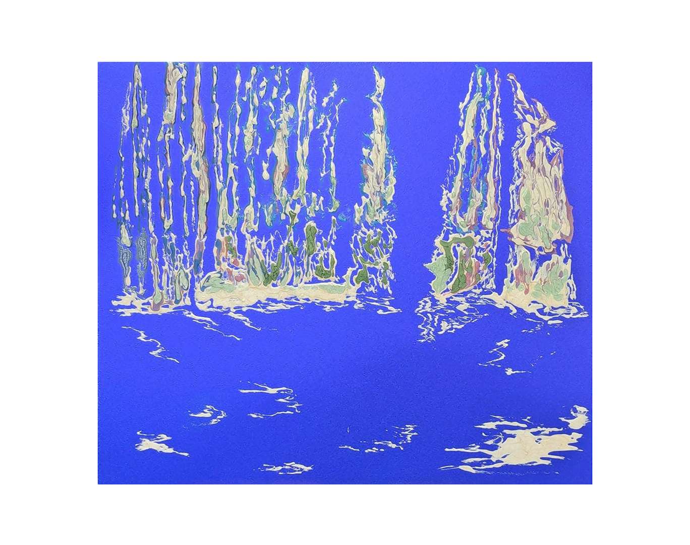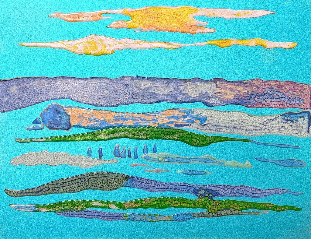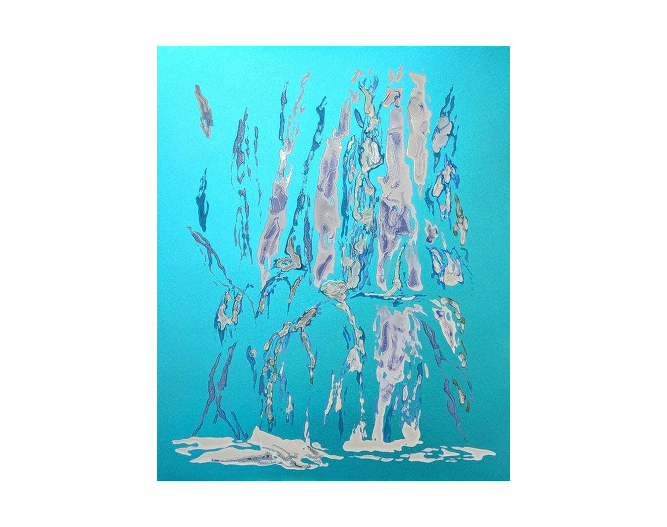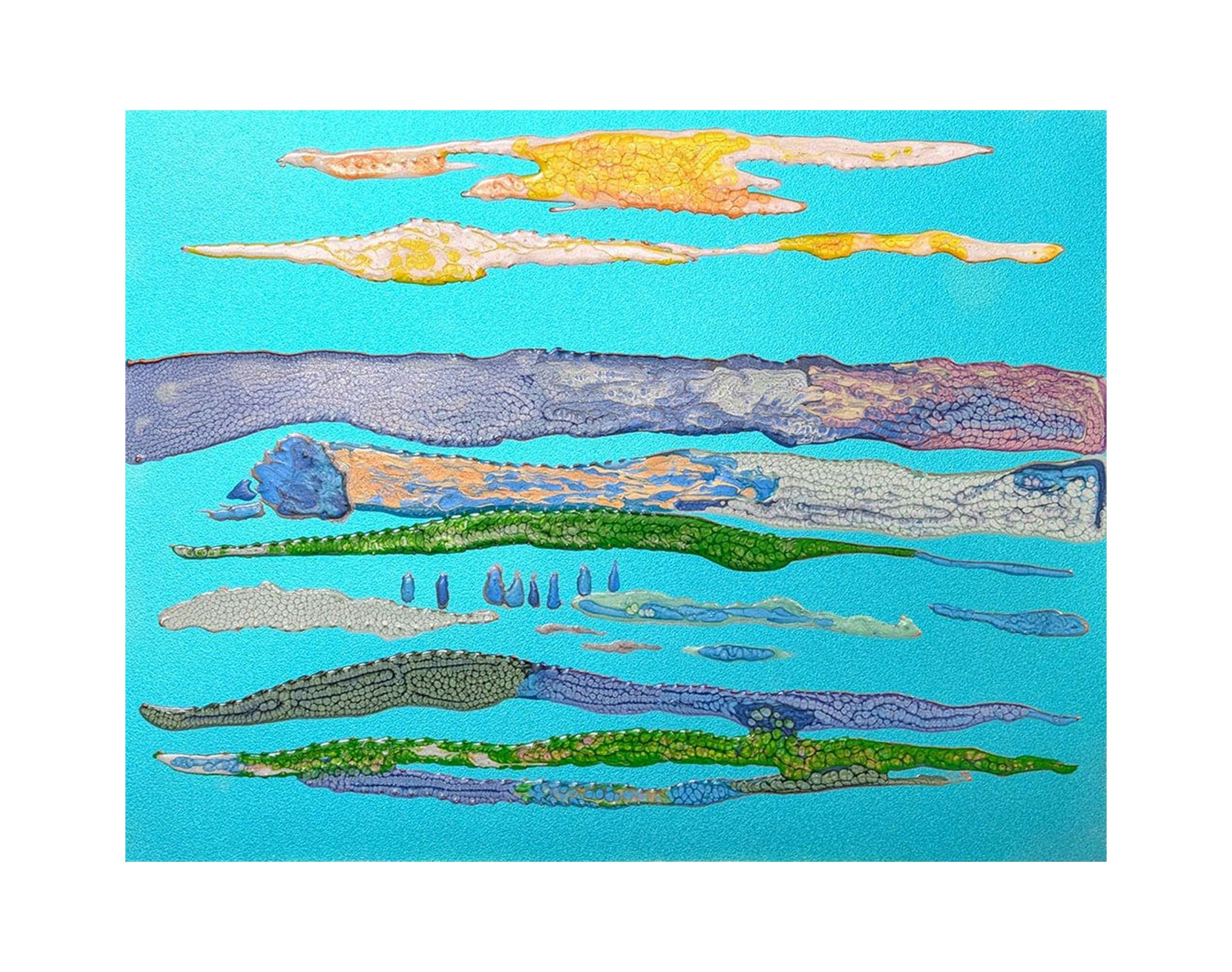 本展では、陽極酸化皮膜を施したチタンにアルキド樹脂絵具を重ね合わせた絵画作品を発表。光の屈折から色彩が変化する作品の表面は、鑑賞者の位置や視線の角度、距離、高低差によって異なる表情を見せます。アルキド樹脂絵具で描かれた箇所には、気泡のように分裂する表情が現れ、網の目をくぐり抜けるように下層の色彩が浮かび上がる構造を成しています。それは雲や花を彷彿とさせ、一定の姿を留めない存在のようにも感じられます。会場は絵画作品約13点で構成、加えて10×10センチメートルの小作品も発表予定です。会期にあわせ、「OIL」でも出展作を販売いたします。