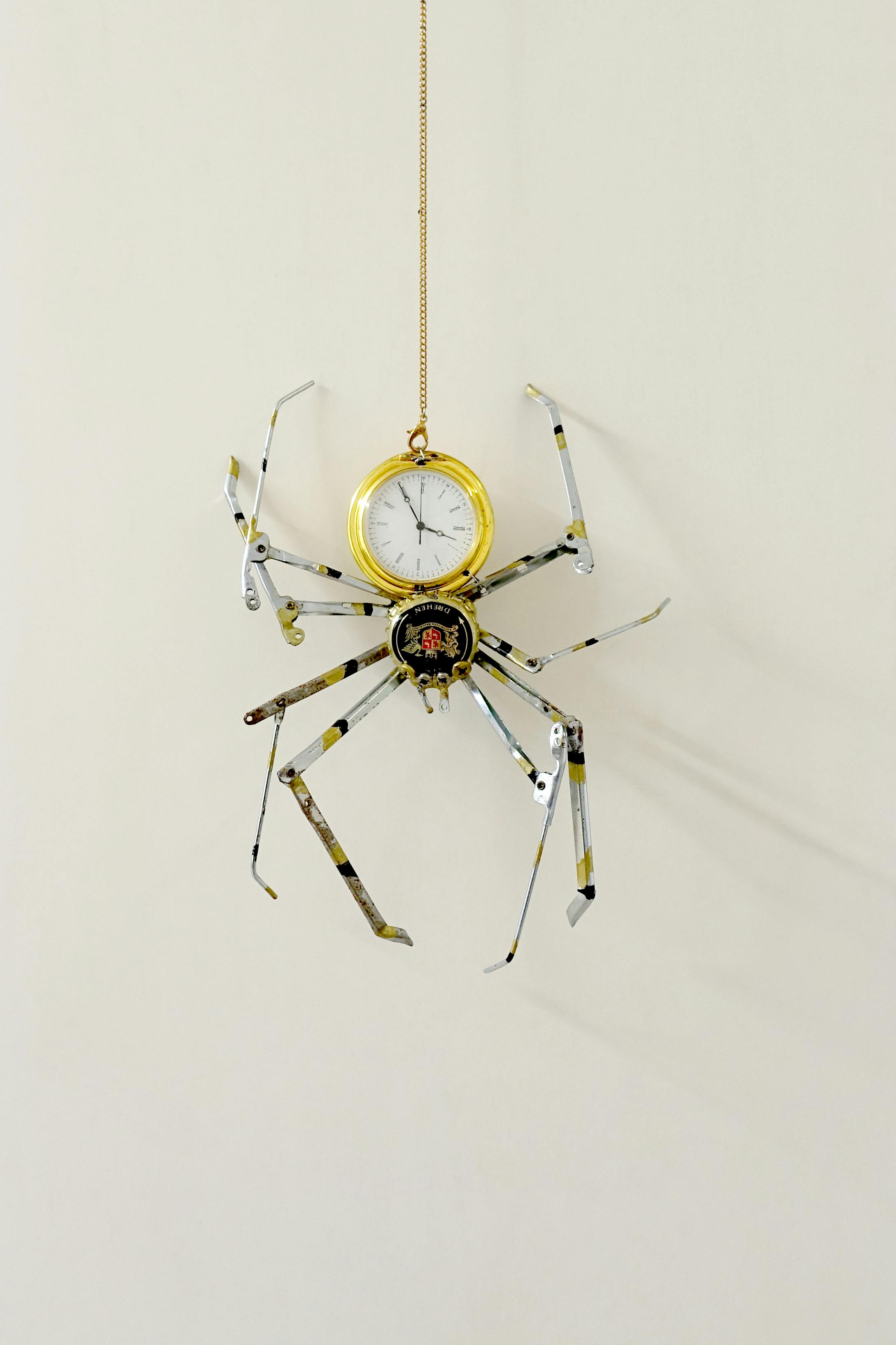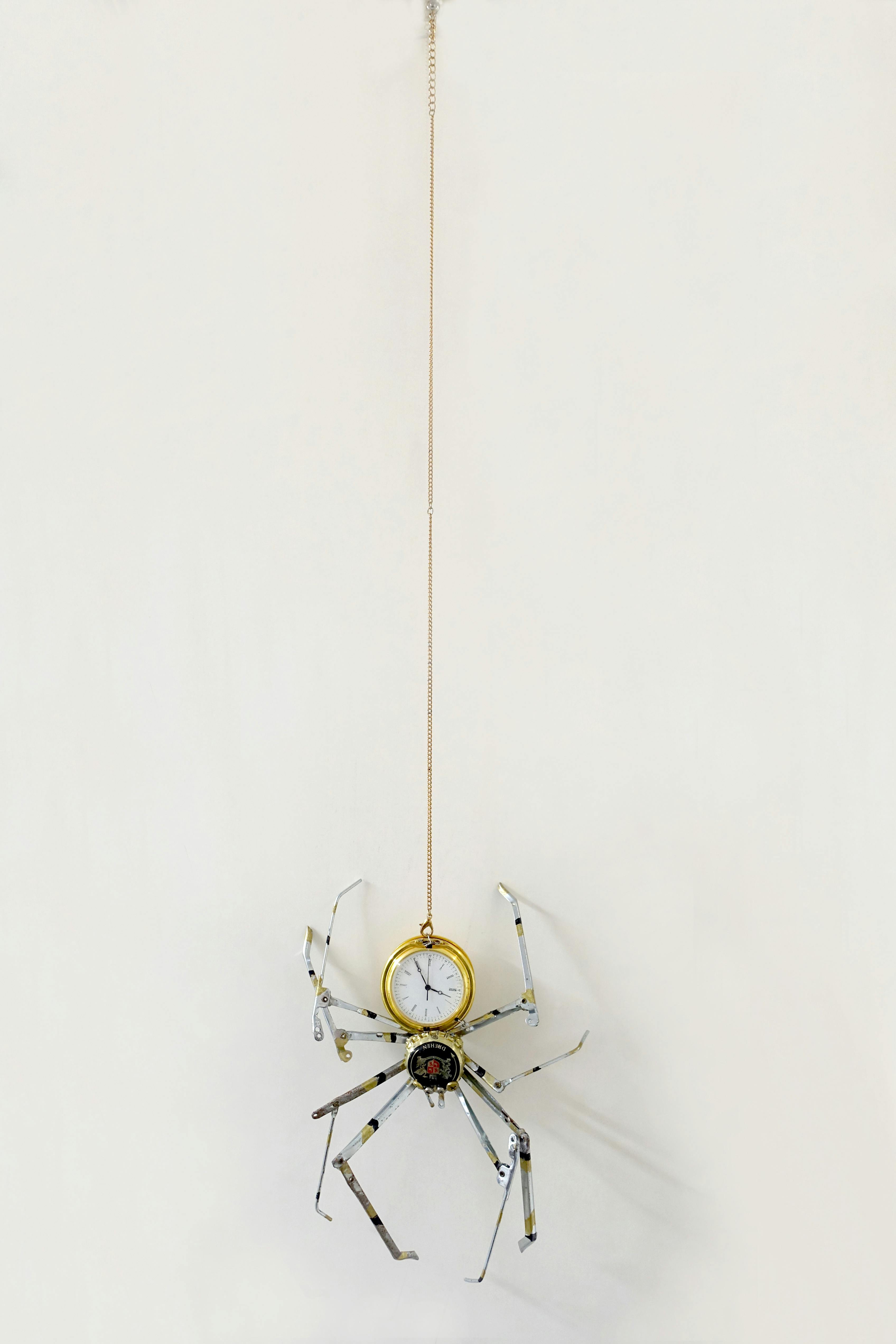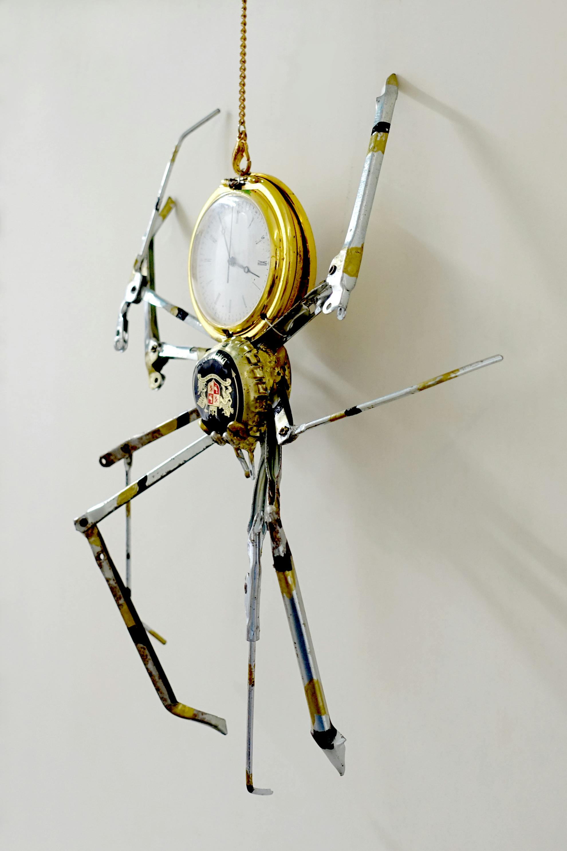 様々な金属廃材を用いた表情豊かな動物の立体作品の発表を続ける富田菜摘の新作です。懐中時計や折り畳み傘の骨など、さまざまなパーツが組み合わされています。