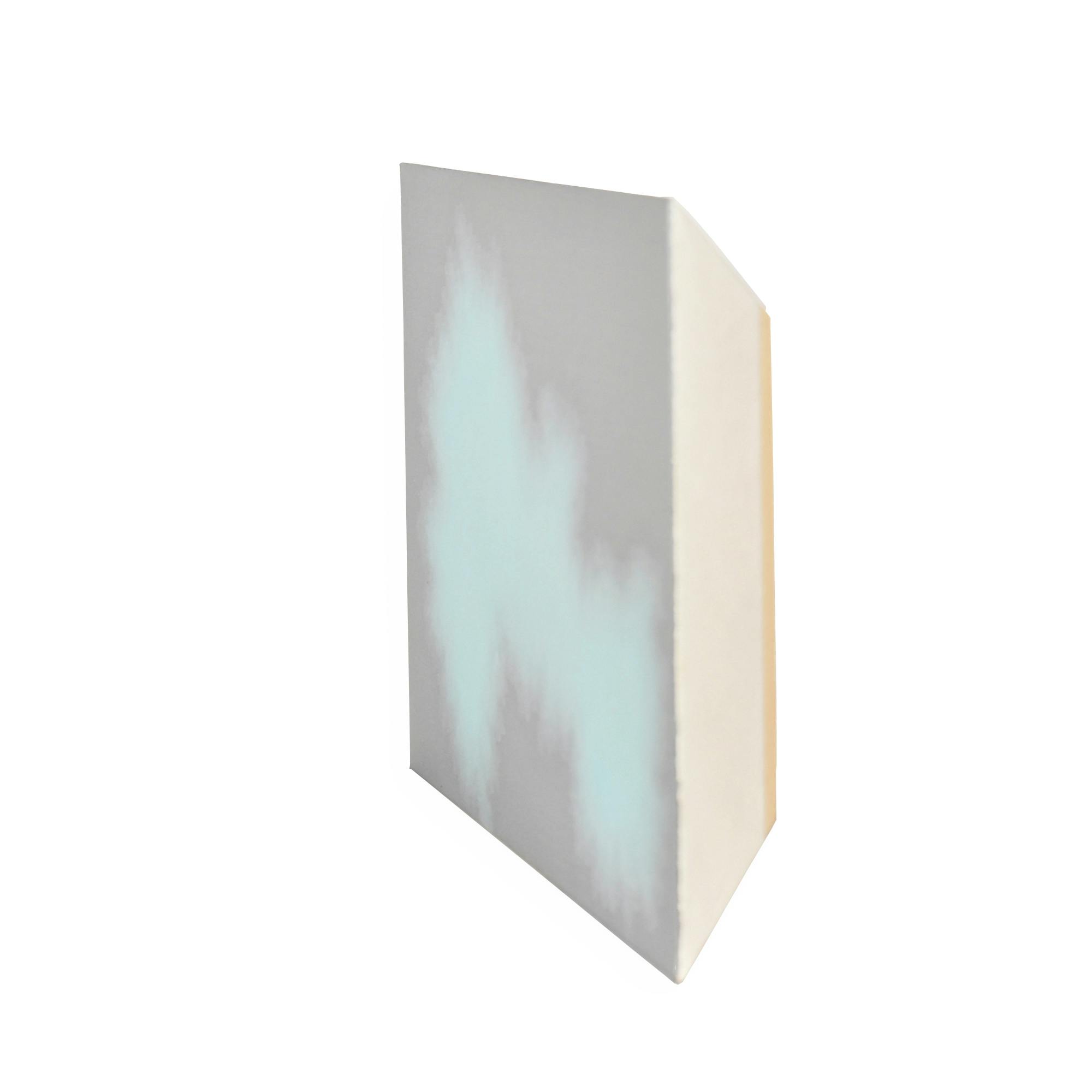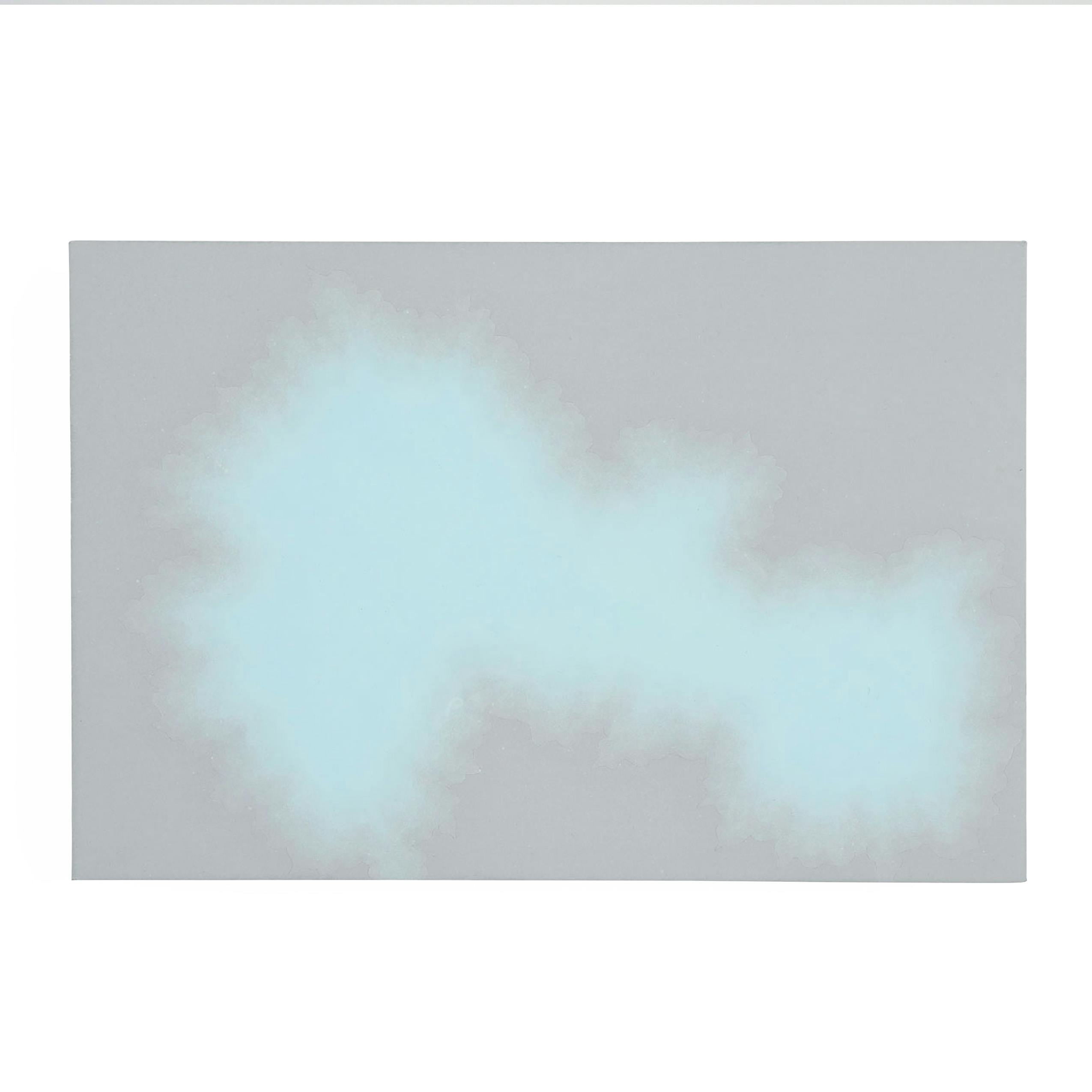 石橋の絵画は、日本画で使われる岩絵具や胡粉などの素材を何層にも重ねて作られています。光がその表面に当たると、絵の中で反射や屈折をくり返し、さまざまな色合いを見せます。《Blue Fog》は青い光を放ちながら、見る角度や光の加減によって違う色も感じられる作品です。パネルの側面が45度に傾いているため、正面からは側面が見えず、絵そのものが光の中に浮かんでいるように見えます。